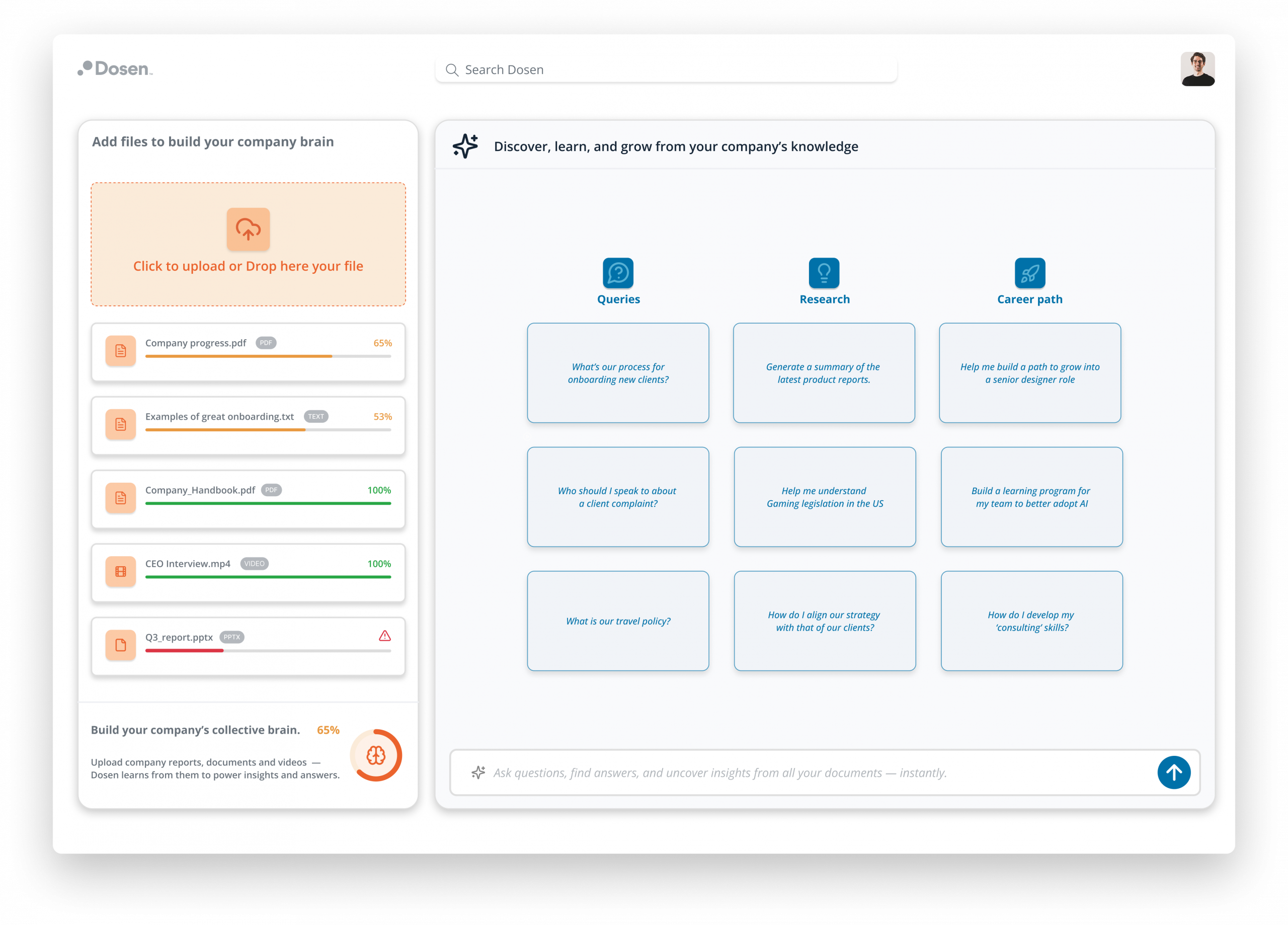 At Dosen, we believe knowledge should be captured once and available forever. Every process, playbook, and insight should be consolidated to create a knowledge-driven workforce – so employees, powered by Al Copilot, always have access to the information they need.