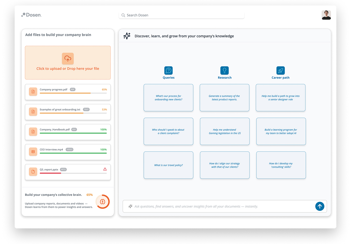 At Dosen, we believe knowledge should be captured once and available forever. Every process, playbook, and insight should be consolidated to create a knowledge-driven workforce – so employees, powered by their AI Copilot, always have access to the information they need.